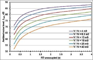 Sia il tempo di riverbero che il volume per persona sono parametri importanti per il controllo del livello di rumore. Se il tempo di riverbero è superiore a 1,5 s e il volume per persona è inferiore a 10 m3, il livello di rumore ambientale può superare gli 80 dB, cioè molto forte e chiaramente sgradevole.