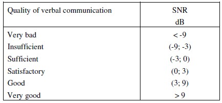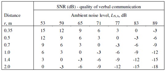 La tabella 2 fornisce l'SNR in funzione del livello di rumore ambientale e della distanza di comunicazione. Le celle più importanti nella tabella sono quelle con SNR = -3 dB, perché questo è il limite per una qualità sufficiente della comunicazione verbale.