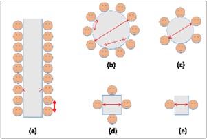 Esempi di configurazioni di tavoli tipiche di ambienti di ristorazione sono illustrati schematicamente nella Figura 6. In un tavolo rettangolare di grandi dimensioni, la conversazione risulta agevole con la persona seduta accanto (r ≈ 0,5 m), mentre diventa progressivamente più difficile con interlocutori disposti sul lato opposto (r compresa tra 0,7 m e 1,0 m), in funzione della larghezza del tavolo. Nel caso di tavoli rotondi da dieci posti, comunemente utilizzati nei banchetti, la conversazione fra persone poste ai lati opposti (r = 2 m) risulta generalmente impossibile, poiché richiederebbe un livello di rumore massimo di circa 59 dB, come riportato nella Tabella 1.
