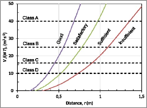 La rappresentazione grafica mostrata in Figura 3.3 si basa sull’equazione dell’SNR, che correla il rapporto segnale/rumore (SNR) ai parametri V/(N T) e alla distanza di comunicazione verbale (r). Per una distanza di riferimento pari a r = 1,0 m, il valore V/(N T) = 20 individua il limite tra condizioni di comunicazione vocale sufficienti e insufficienti, assunto come riferimento per la definizione del requisito acustico.