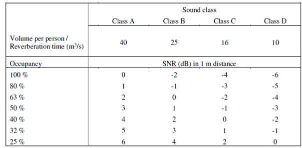 Alcuni paesi utilizzano la classificazione acustica per gli edifici, ad esempio quattro classi A, B, C e D dove la classe A è la migliore, la classe C è i requisiti minimi per i nuovi edifici e la classe D è applicabile per gli edifici più vecchi. La tabella 3 mostra i requisiti suggeriti per il tempo di riverbero suddivisi in quattro classi. Queste classi di suoni sono indicate nella Figura 3.3.