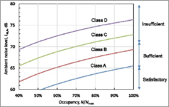 SNR = 0 dB, che è la linea di confine tra soddisfacente e sufficiente. Lo stesso SNR = 0 dB si ottiene in classe C con un'occupazione del 40 %. La figura 8 mostra il livello di rumore ambientale stimato in funzione dell'occupazione per le quattro classi sonore.